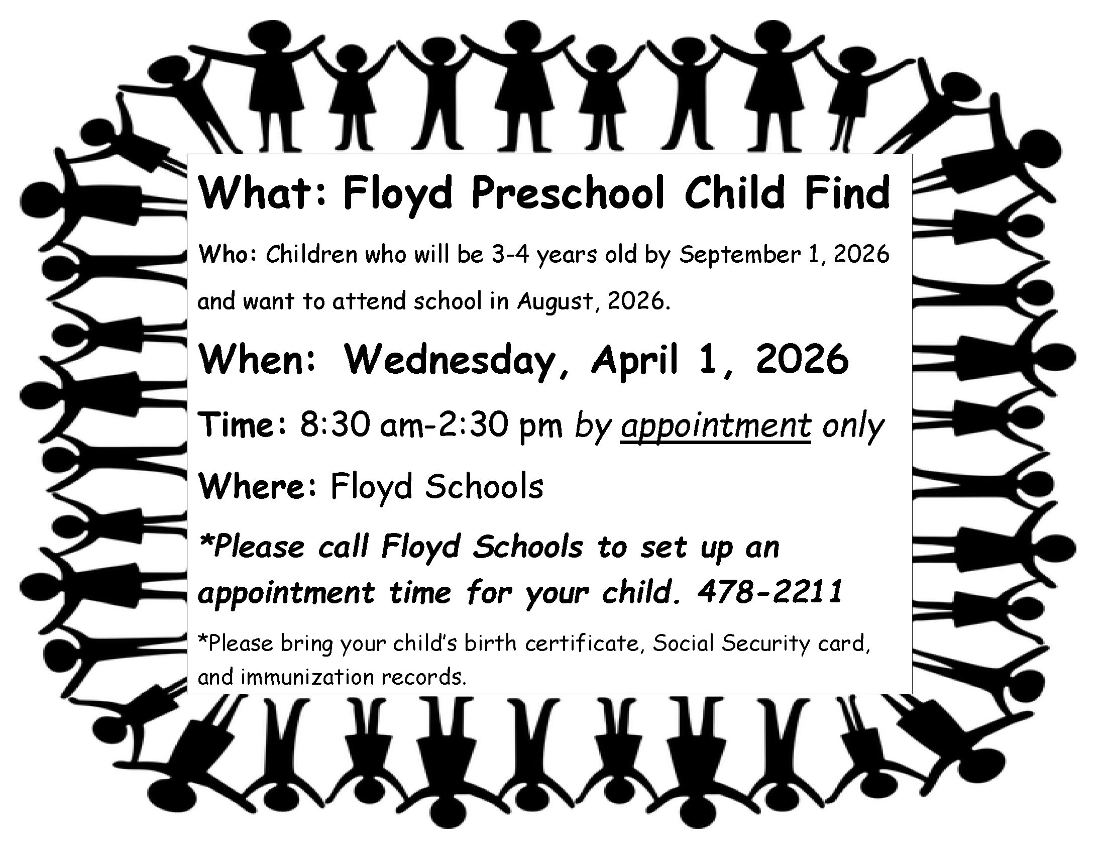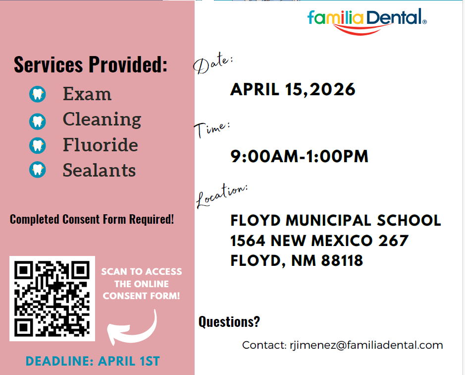 Registration can be accomplished in person, at the Floyd Schools front office. Required documents include proof of residence, birth certificate, and immunization records. Please call the front office, at (575) 478-2211 should you have any questions.